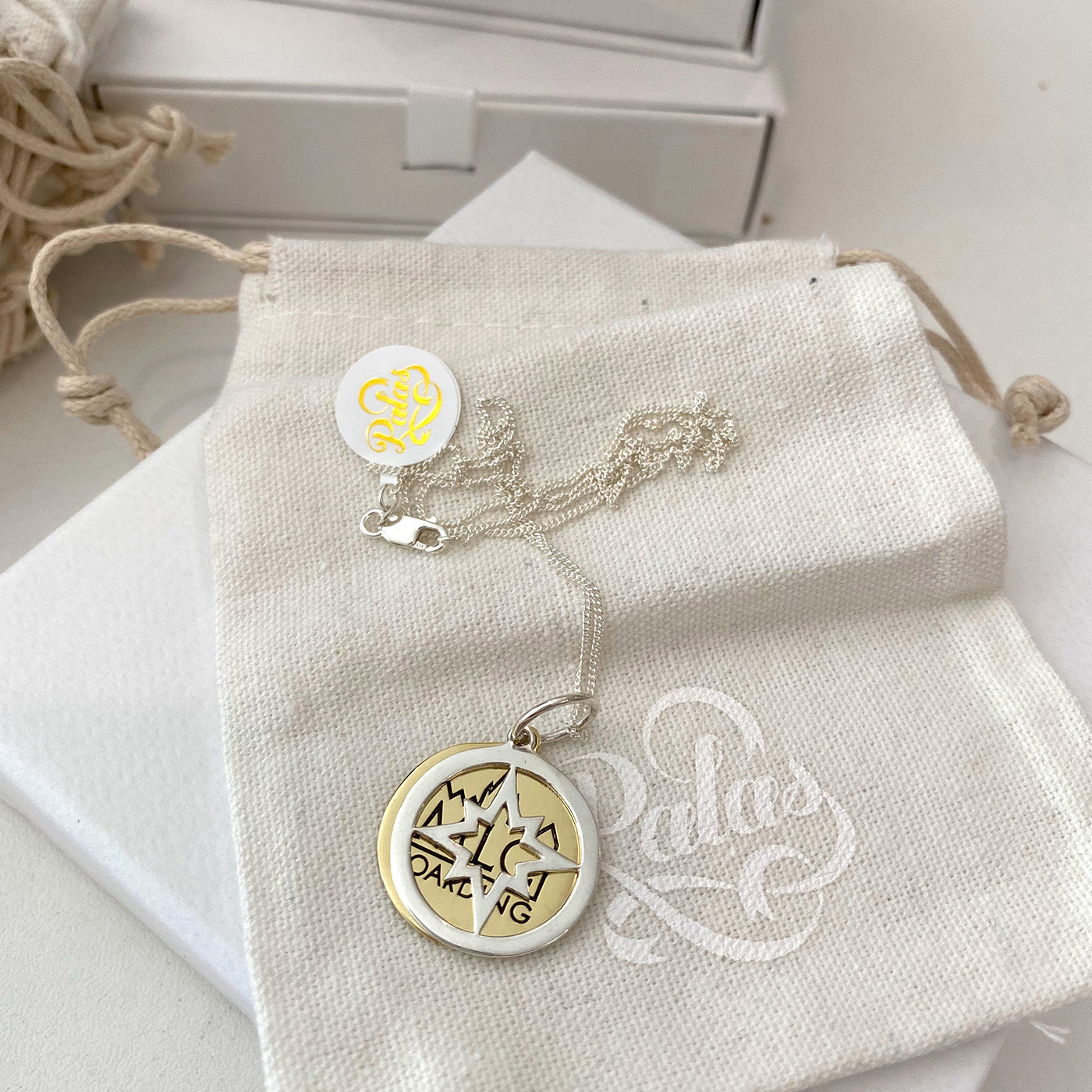 Designed in Australia by Anna Dimond and handcrafted in Indonesia. We also manufacture some elements in Italy and China. Solid sterling silver 925, brass and bronze. All of the metals will tarnish naturally over time. Silver and yellow brass are our most popular combination. We offer polishing cloths for sale if required.