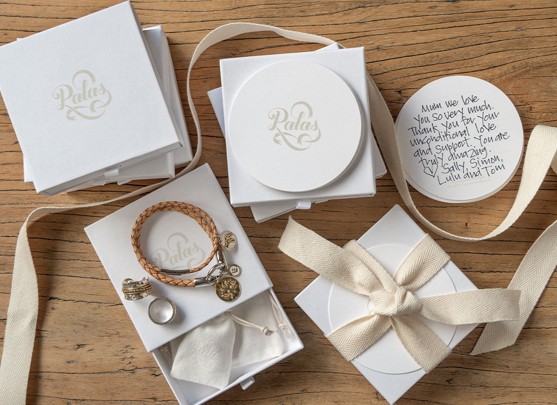Our 100% recycled branded gift boxes are the perfect way to showcase your heartfelt Palas gift. Your jewellery gift will be placed in a Palas cotton jewellery pouch. We will hand write your personal message on the gift card and attach it to the gift box with a beautiful natural cotton ribbon for only $5.